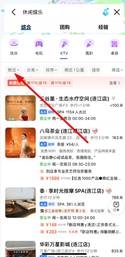 3、进入后默认展示周边相关美食或酒店信息,可点击附近选项设置搜索范围,筛选符合需求的美食或酒店。