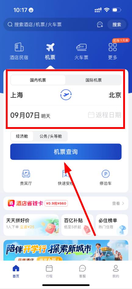 3、选择国内机票或国际机票,并输入出发地、目的地和出行日期。