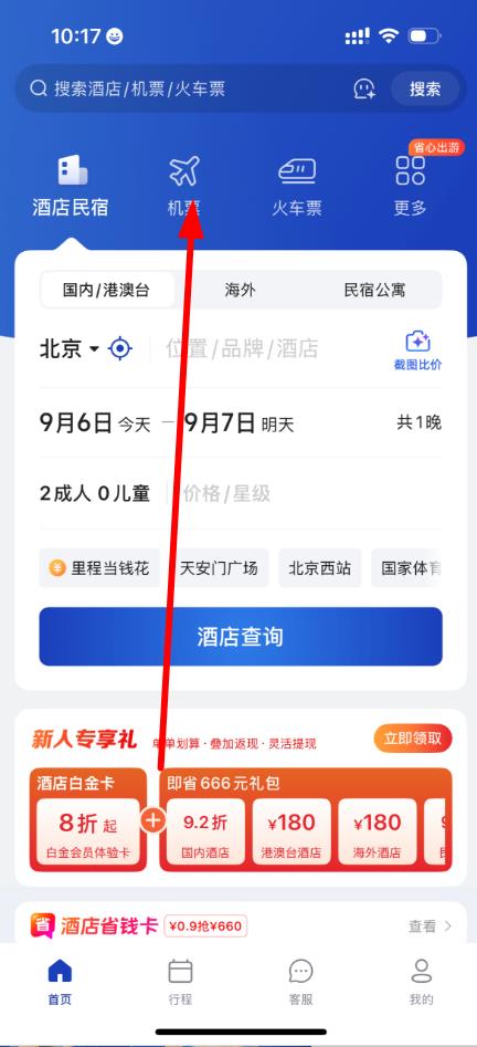 2、在首页点击机票选项,进入机票预订界面。