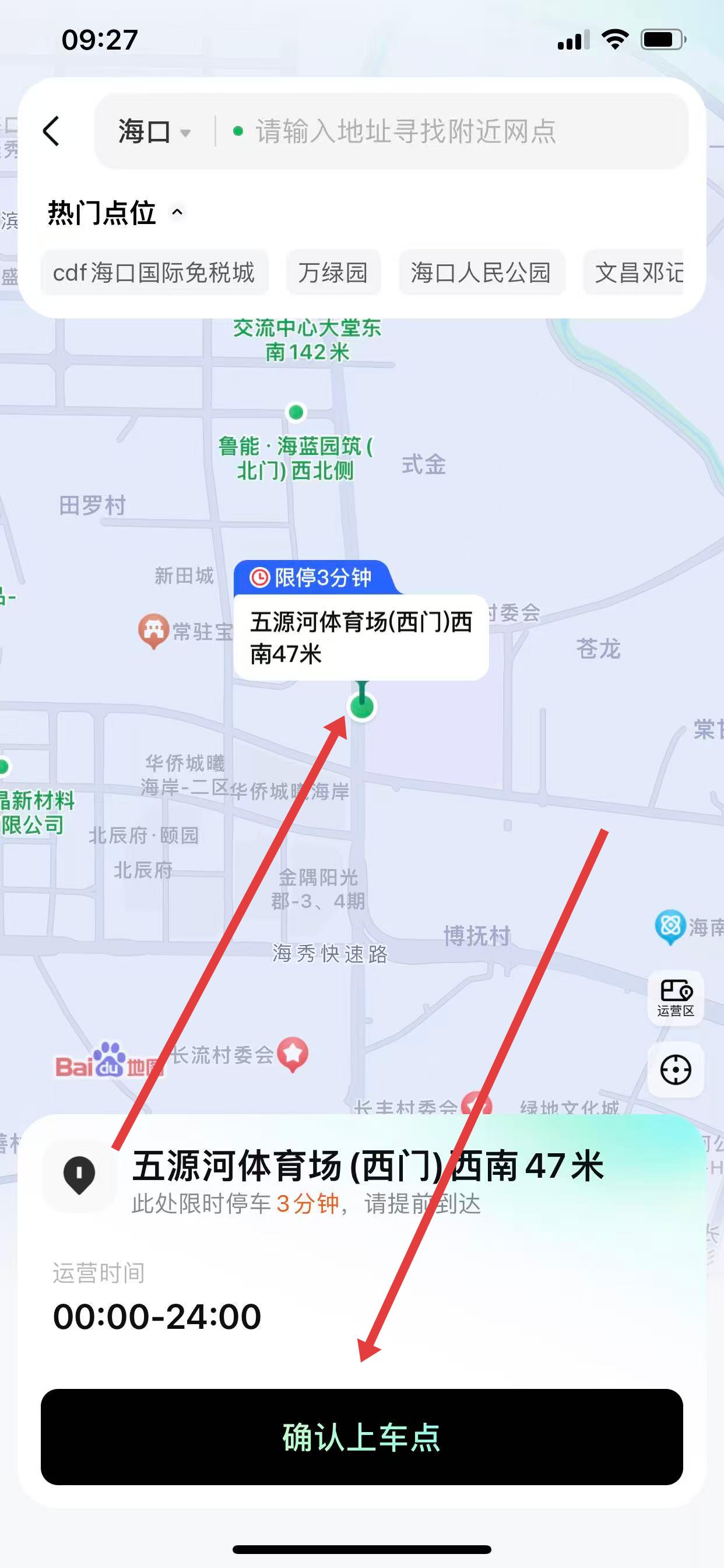 2、在地图上查看可选上车点,选择合适的上车点后,点击确认上车点。