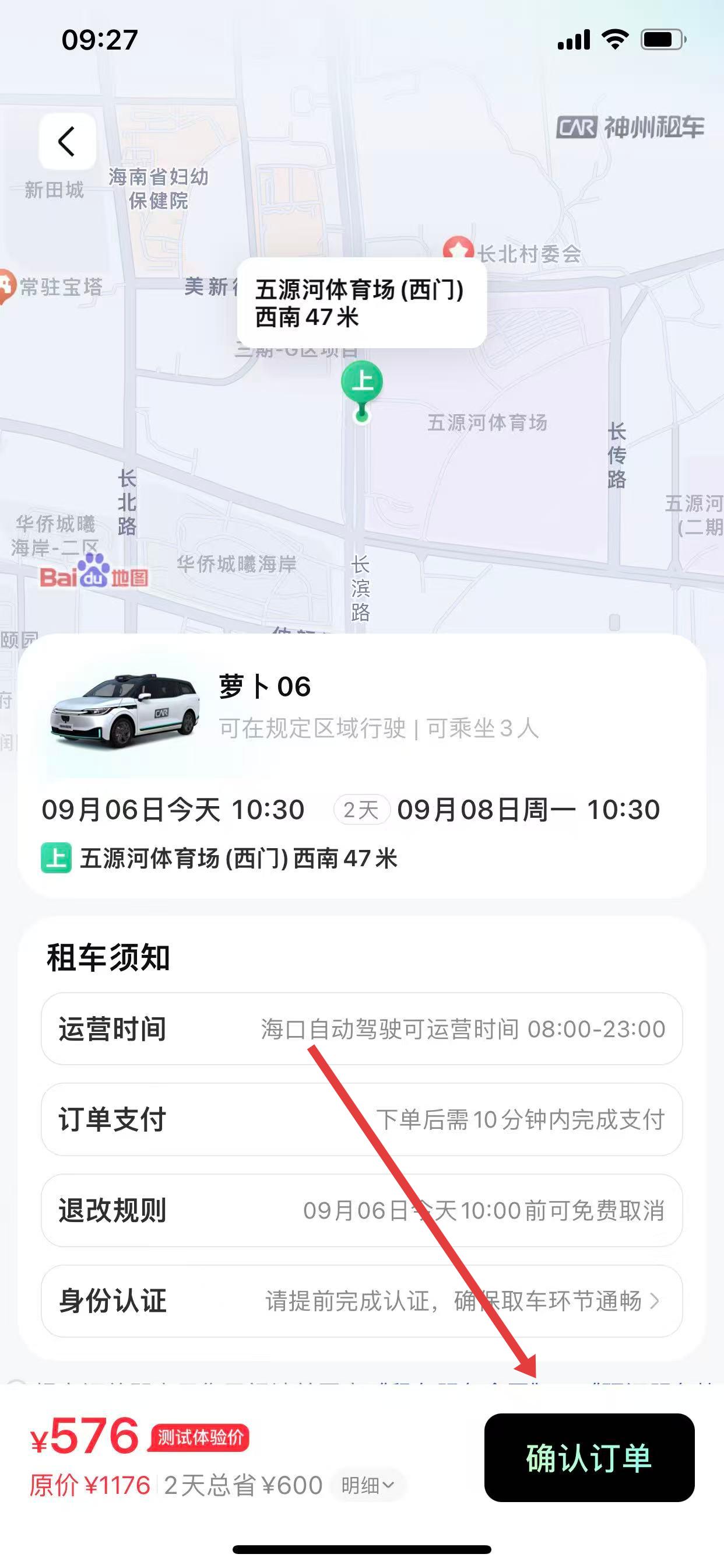 4、进入订单确认页面,查看租车须知、费用等信息,点击确认订单。