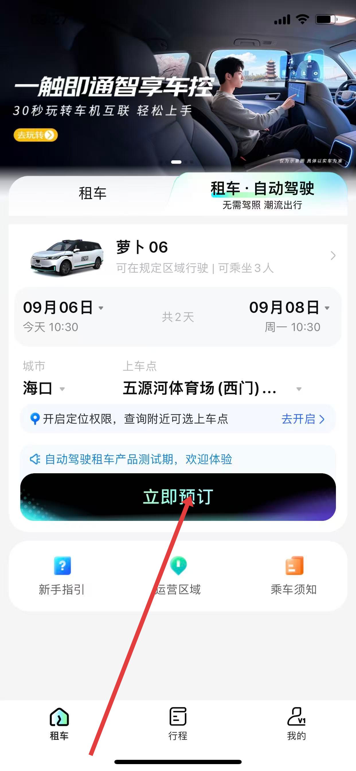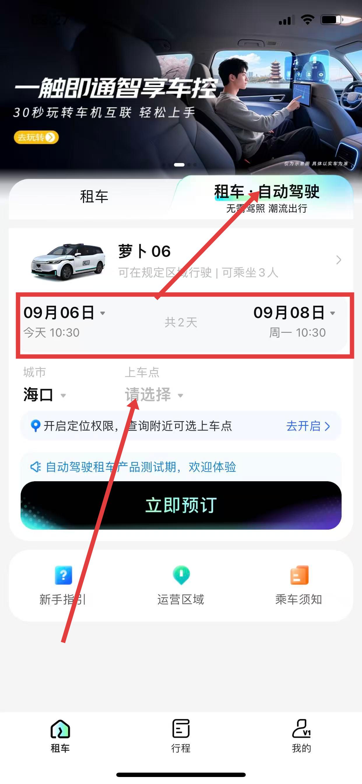 1、打开神州租车App,进入租车·自动驾驶页面,选择取车日期、还车日期,点击请选择上车点。