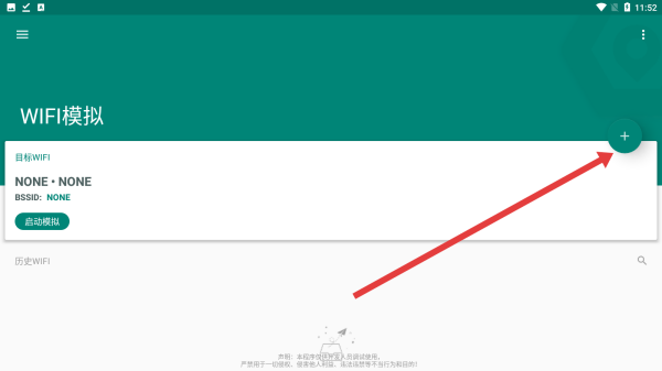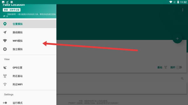 1、在FakeLocation应用左侧菜单栏点击WIFI模拟选项,切换至WIFI模拟功能界面,启动无线网络模拟配置流程。