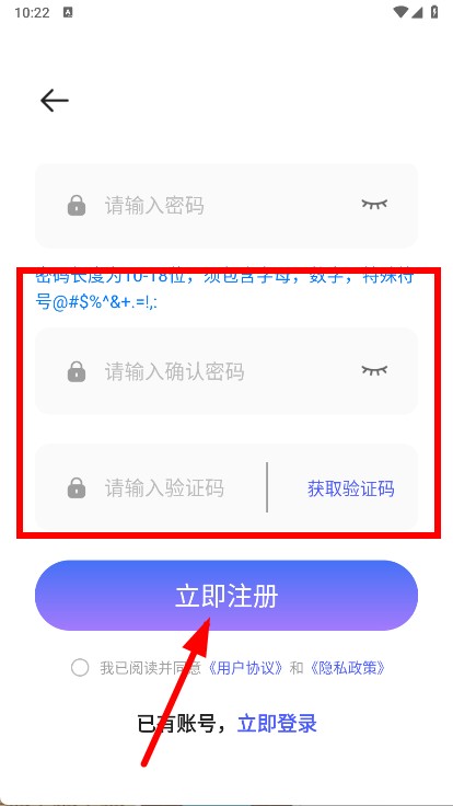 4、再次输入密码,获取并输入验证码,勾选同意相关协议后,点击立即注册。