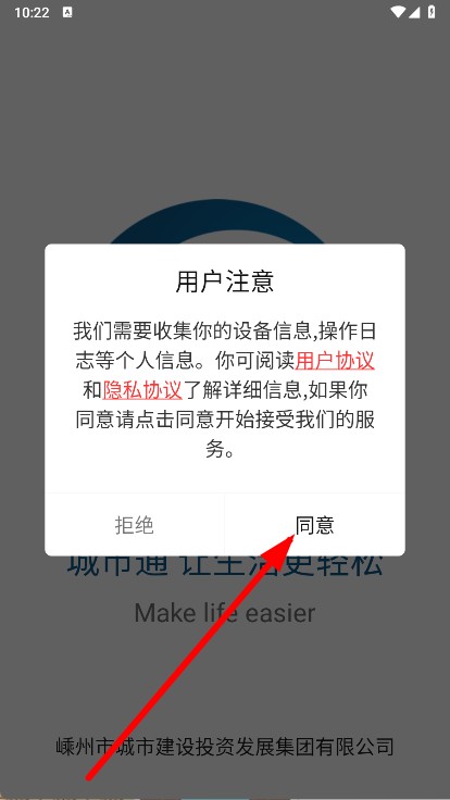 1、打开嵊州城市通,在用户注意窗口点击同意。