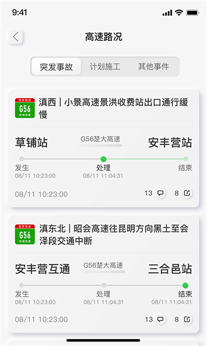云南公投高速公路运营管理中心,通过云南高速通APP向全省高速公路驾乘人员,实时播报高速公路交通事件、施工信息、出行提示等信息,方便驾乘人员及时、快速、准确地掌握高速路况。