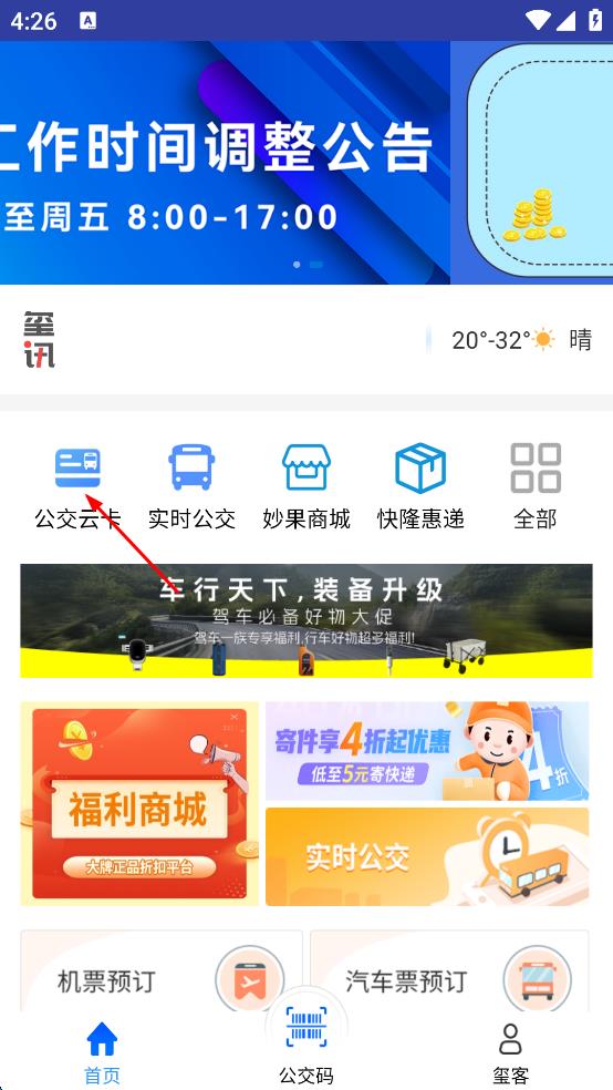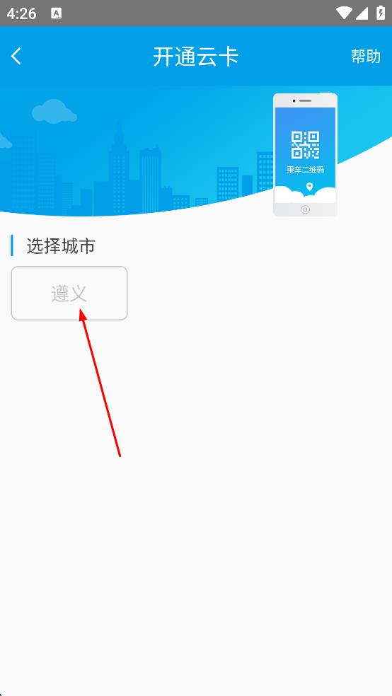 1、打开公交应用,在首页点击“公交云卡”,进入开通云卡页面,选择城市为“遵义”。