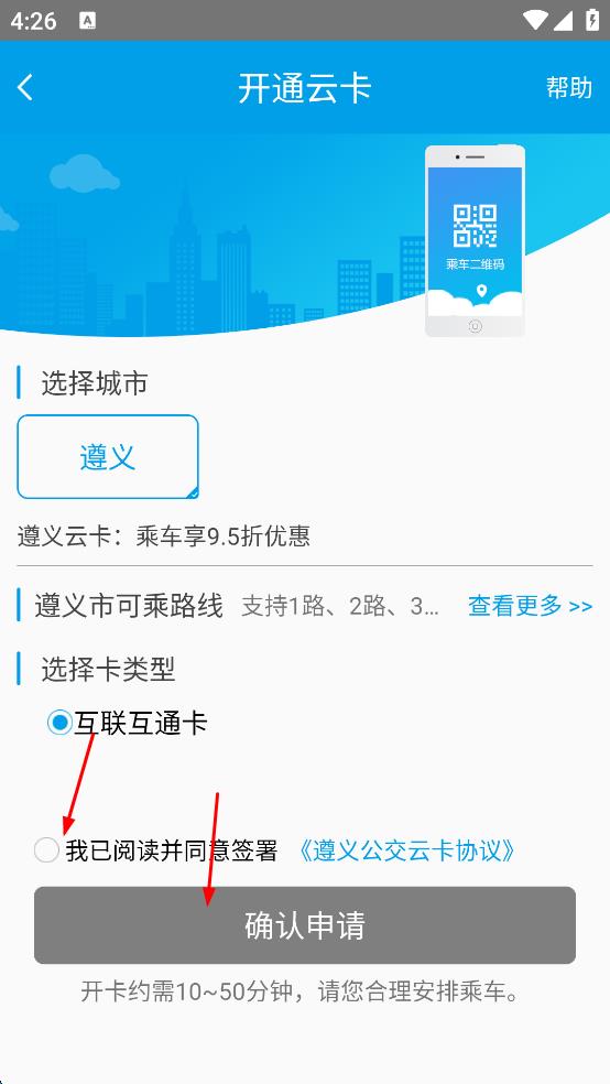 2、确认城市后,在卡类型选择“互联互通卡”,勾选“我已阅读并同意签署协议”。