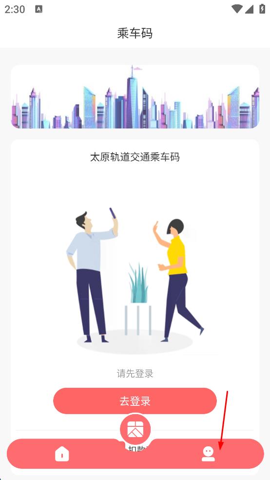 1、打开某交通APP,进入“乘车码”页面,看到“请先登录”提示后,点击页面底部右侧的个人中心图标,进入个人中心页面。
