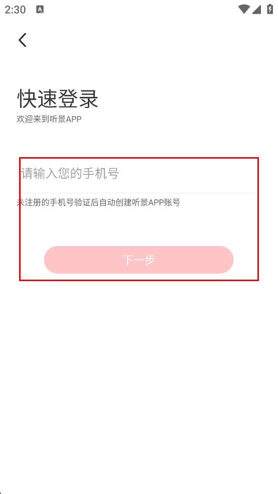 3、在快速登录界面,输入手机号码,点击“下一步”,按照提示完成后续验证步骤,未注册的手机号验证后会自动创建该APP账号,从而完成登录。
