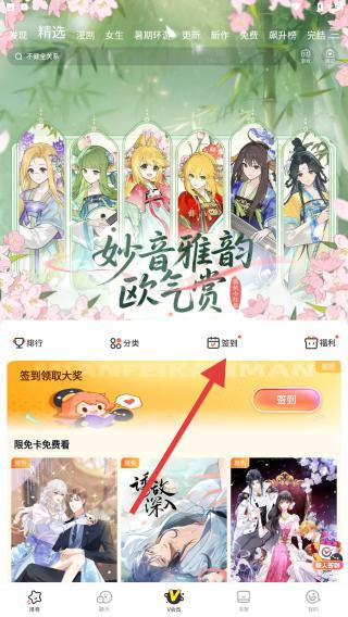 2、进入到精选页面的内容中,可以先进行签到来领取签到奖励,也可以点击想看的漫画进行浏览阅读。