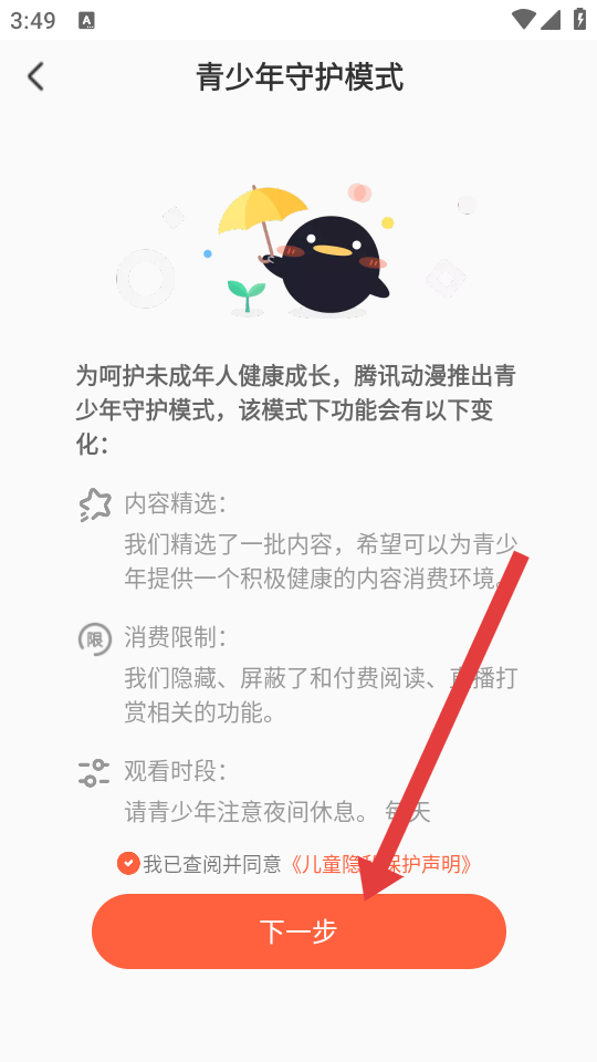 2、进入青少年守护模式的页面,勾选我已查阅并同意儿童隐私保护声明,然后点击下一步。
