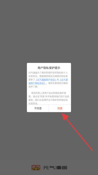 1、打开元气漫画APP,进入时会弹出用户隐私保护提示,点击同意的按钮。