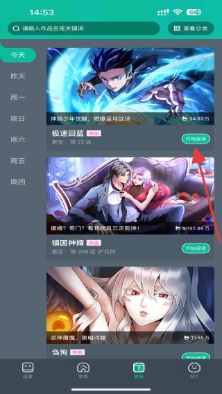 2、在更新列表中,找到想阅读的漫画,点击漫画封面或右侧的开始阅读按钮。