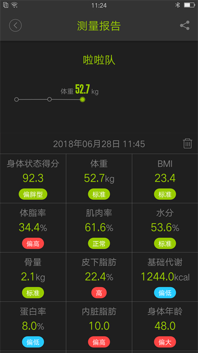 2.实时报告及阶段分析:根据个人目标及检测结果,提供个性化的减脂或增重建议,并提供阶段性分析报告。阶段曲线更可以让自己的阶段成果一目了然。