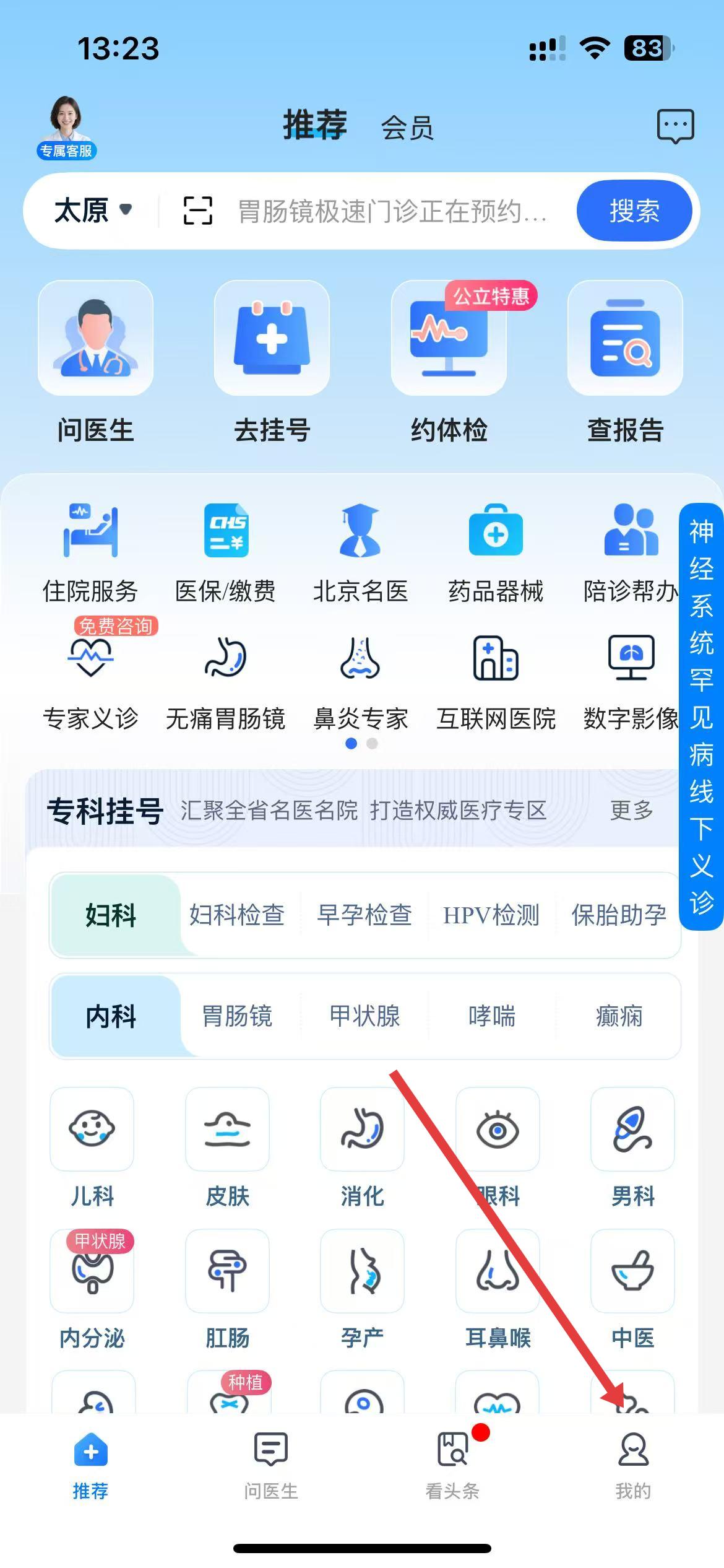 1.首先打开下载好的山西挂号app进入首页,点击【我的】