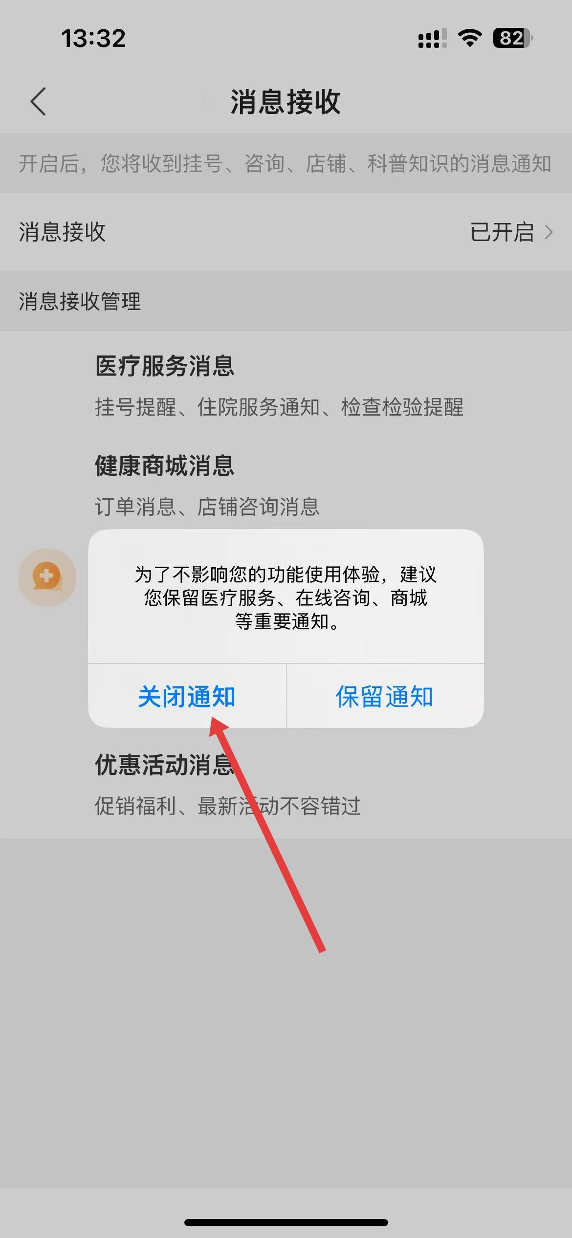 6、在弹出的提示框中选择关闭通知,即可关闭健康山西app的消息通知。
