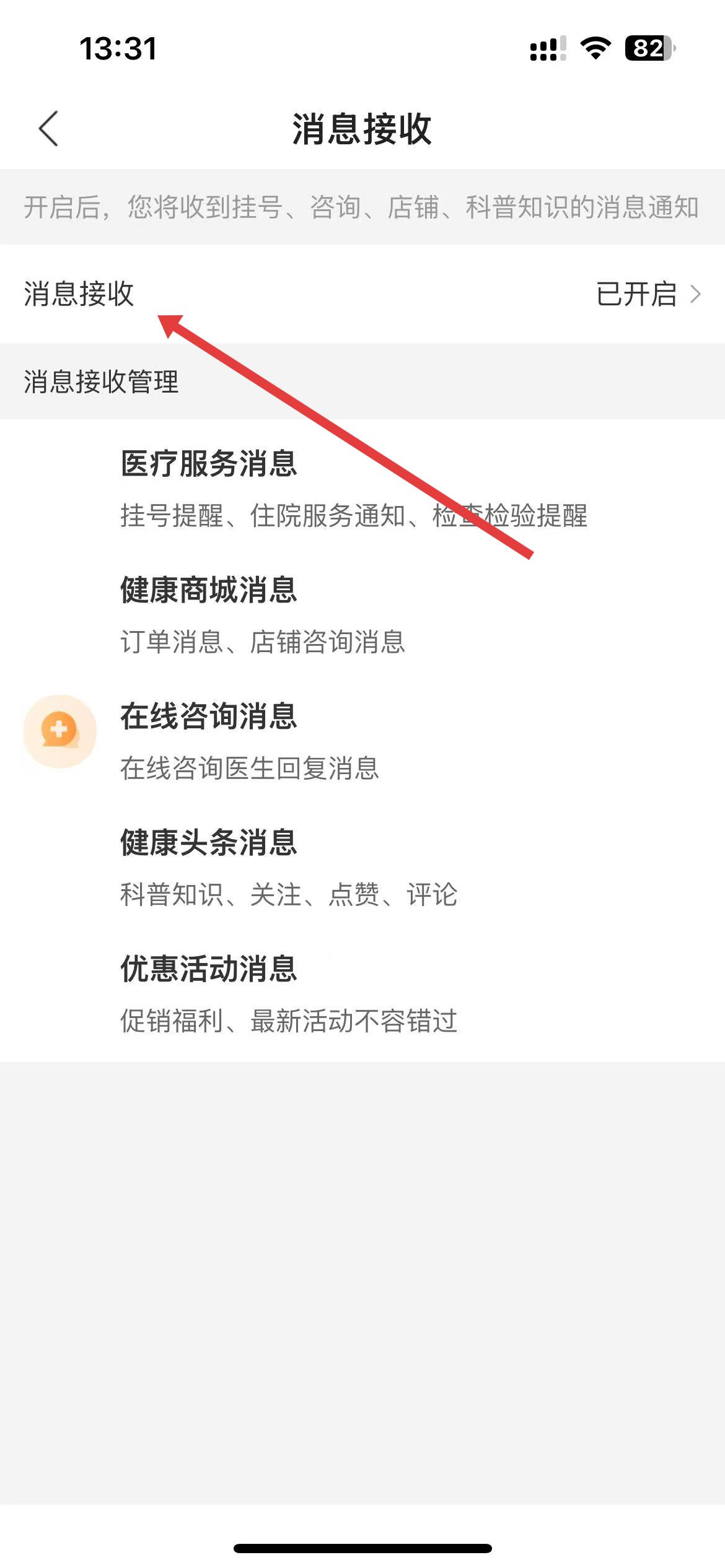 5、在消息接收页面里,显示消息接收是开启状态,点击消息接收选项。