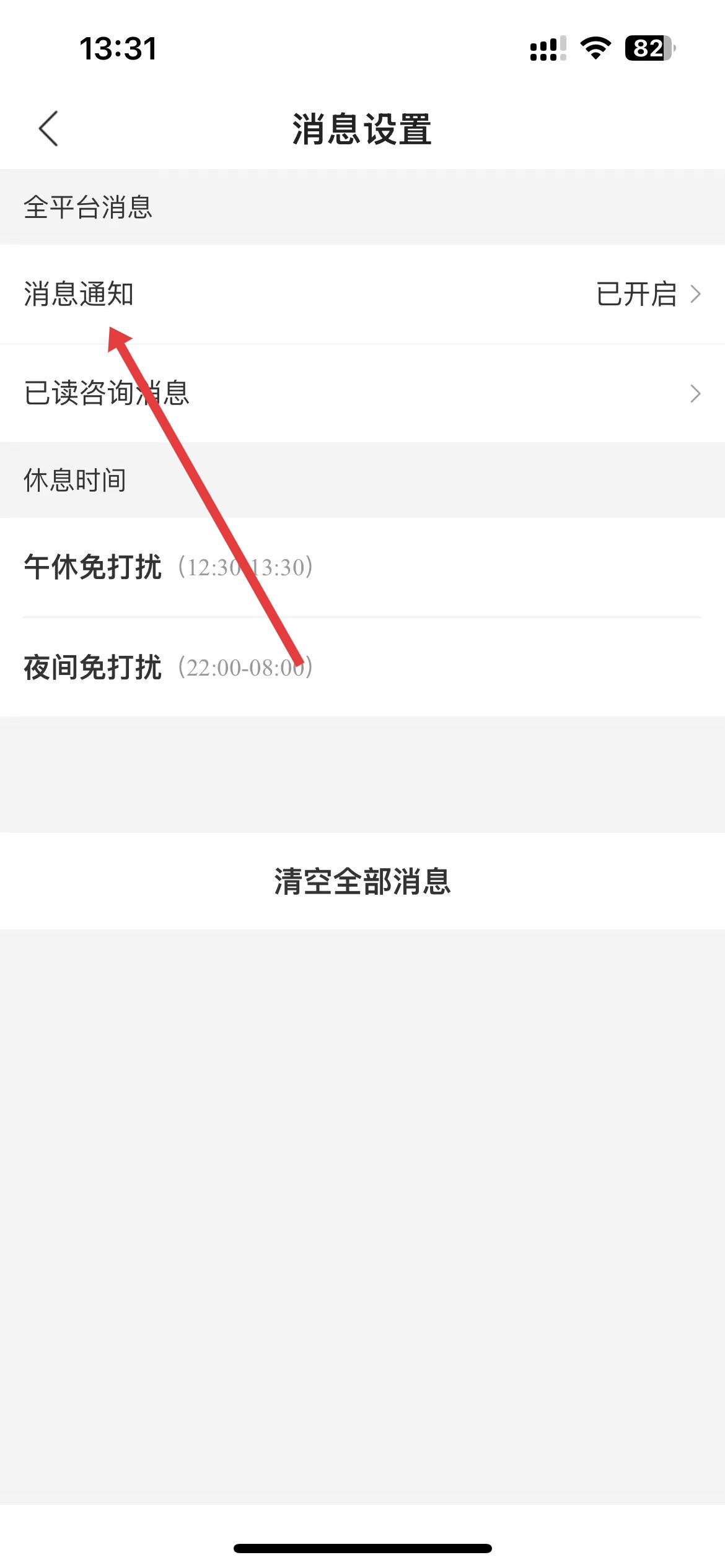 4、在消息设置界面中,点击消息通知选项,进入消息接收设置页面。