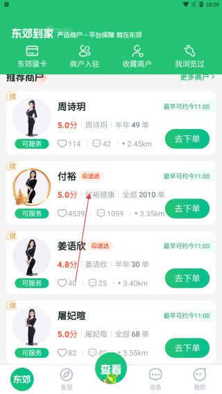 1、打开东郊到家APP进入首页,浏览推荐商户列表,查看周诗玥、付裕等商户评分、订单量及距离信息,点击去下单,选择服务时间与项目,预约上门服务。