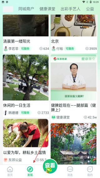 2、切换至发现页面,浏览同城商户、健康课堂等板块内容,点击感兴趣的帖子,如健康课堂视频、公益活动资讯,了解详情,参与互动,获取生活服务与健康知识。