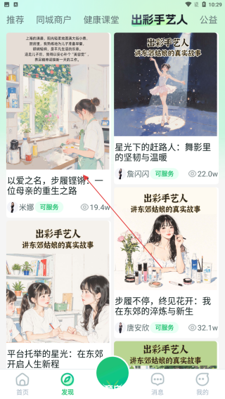 3、在发现页面切换至出彩手艺人板块,查看手艺人故事与作品展示,点击帖子,了解手艺人服务内容,若有需求,可联系手艺人预约专属服务,感受特色技艺。