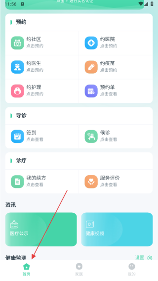 1、打开APP进入首页,使用预约功能,选择约社区约医院等服务,点击对应入口预约,还能进行导诊诊疗操作,查看医疗公示健康视频,进入健康监测板块。