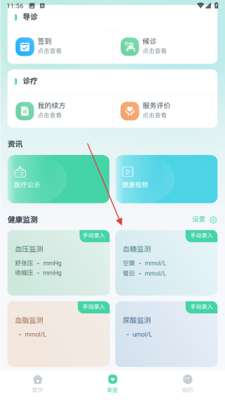 2、切换至家庭页面,在健康监测区域,手动录入血压血糖血脂尿酸等数据,管理健康指标,借助诊疗功能查看我的续方服务评价,获取医疗服务反馈。