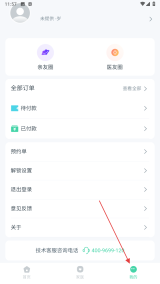 3、进入我的页面,查看亲友圈医友圈,管理全部订单,进行解锁设置退出登录等操作,反馈意见,了解关于信息,拨打技术客服电话解决问题。