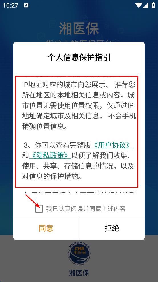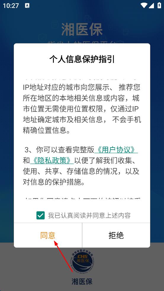 1、打开湘医保APP,弹出个人信息保护指引提示框,认真阅读内容后,勾选“我已认真阅读并同意上述内容”。