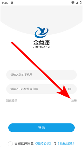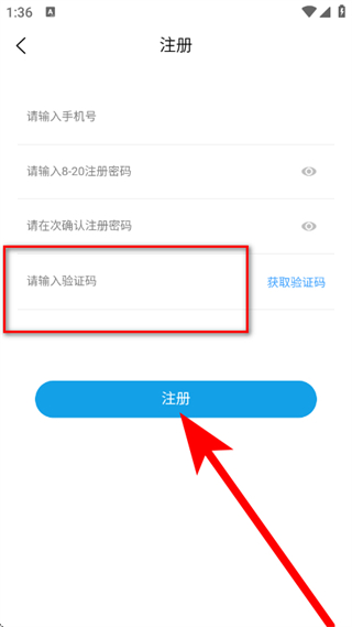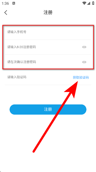 3、输入手机号,设置8-20位注册密码并再次确认,点击获取验证码。