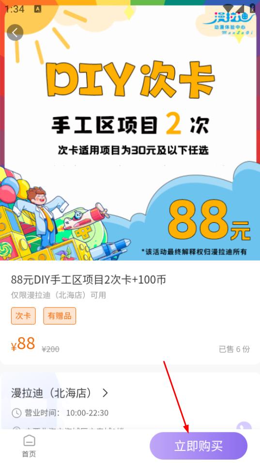 3、在88元DIY手工区项目2次卡+100币详情页,点击立即购买按钮。