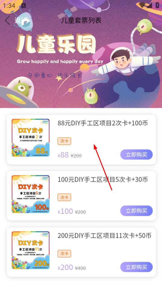 2、进入儿童套票列表后,选择想要的套票,比如88元DIY手工区。