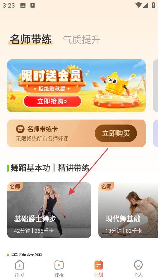2、在计划页面,找到基础爵士舞步课程,点击进入课程详情页。