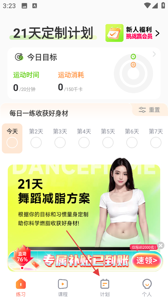 1、在练习页面,点击底部计划按钮,进入计划页面。