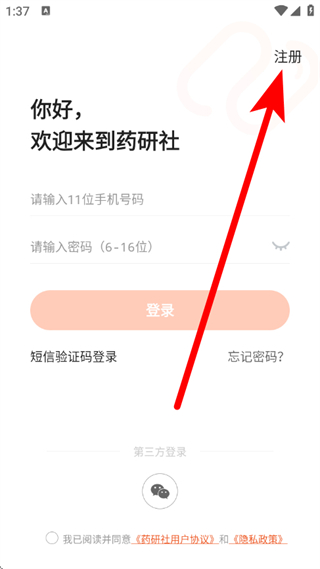 1、打开药研社,在弹出提示框,点击同意,进入欢迎页面。