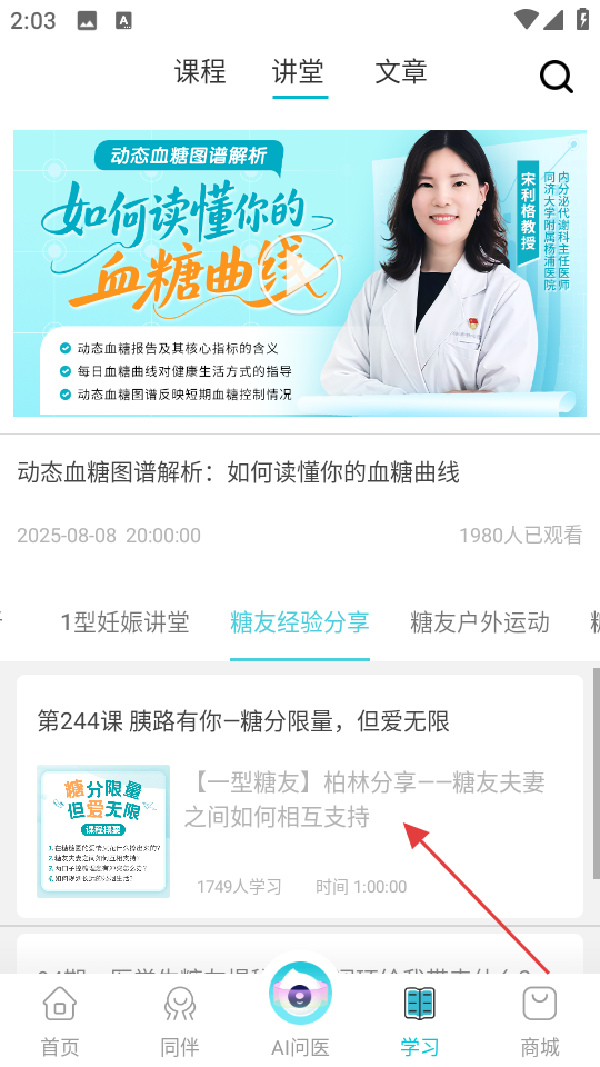 3、选择感兴趣的课程,比如点击第244课胰路有你-糖分限量,但爱无限。