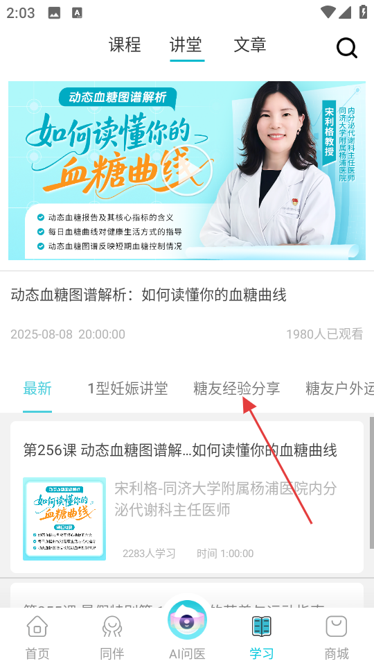 2、进入学习页面后,点击糖友经验分享分类。