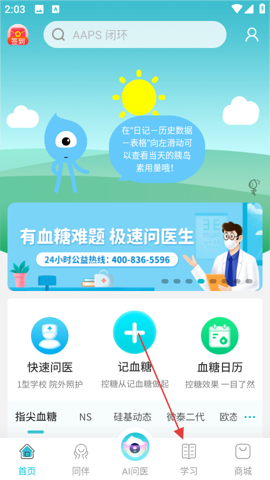 1、打开糖糖圈首页,点击底部的学习选项。