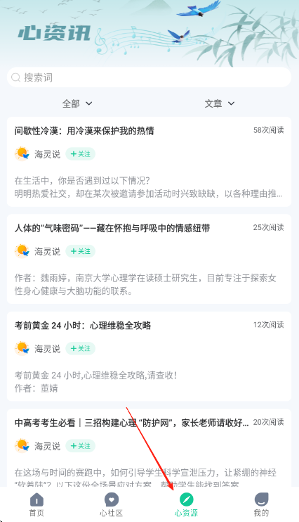 2、切换至心资源板块,进入心资讯页面,挑选如间歇性冷漠解析、考前心理调适等文章,点击阅读学习心理知识,还能关注作者获取更多相关内容推送。
