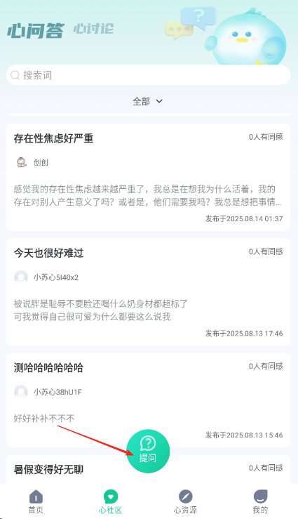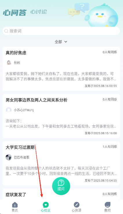 1、开启APP进入心社区页面,浏览用户发布的各类心理相关帖子,如焦虑情绪分享等,点击感兴趣内容查看详情,也可通过提问按钮发布自身心理疑惑。