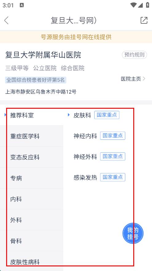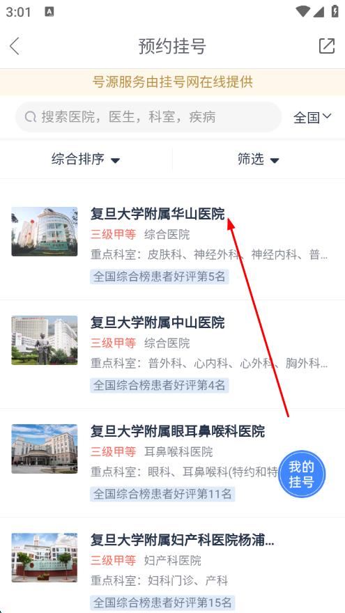 2、进入预约挂号页面,在医院列表中选择想要挂号的医院,如复旦大学附属华山医院。