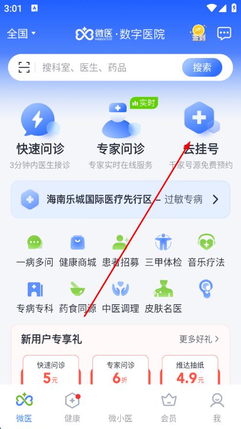 1、打开微医应用,在首页点击去挂号选项。