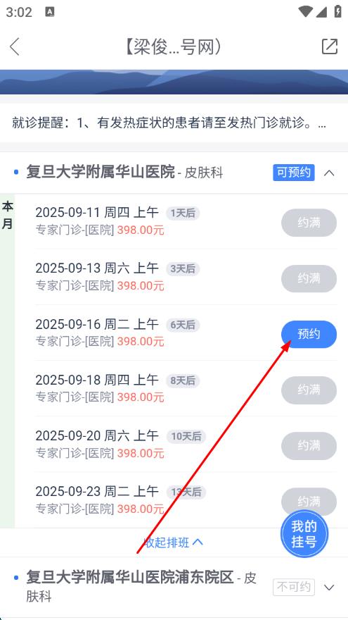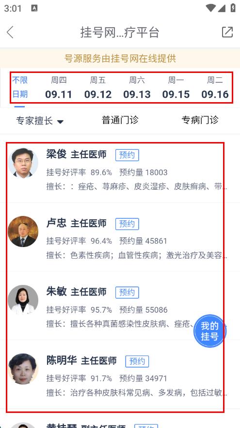 4、选择就诊日期,查看当天坐诊的医生列表,选择想要预约的医生 。
