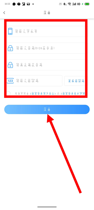 4、填写手机号码、设置密码并确认密码等信息,勾选同意协议后,点击注册按钮,完成账号注册。