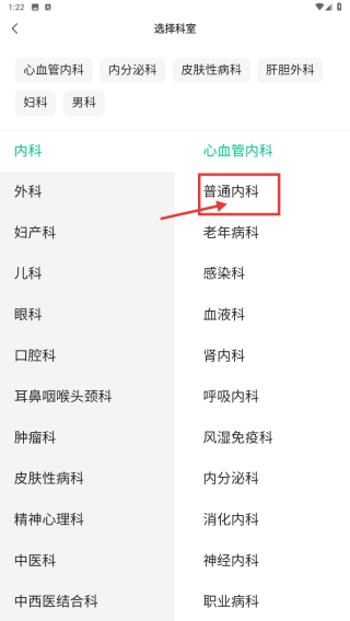 3、在科室选择页面,点击普通内科科室,进入对应医院列表。