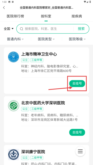 4、在医院列表中,选择目标医院,点击去挂号按钮,完成挂号操作。