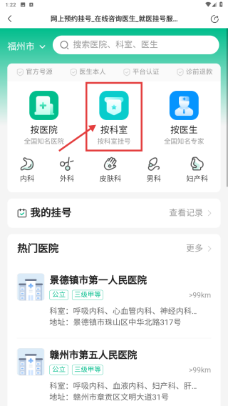 2、在挂号页面,选择按科室挂号方式,进入科室选择界面。