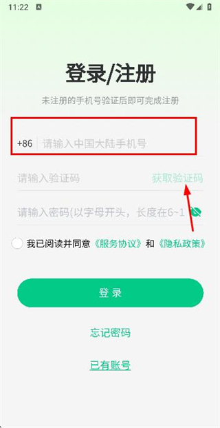 2、在手机登录页面填写手机号,勾选协议后,点击获取验证码。