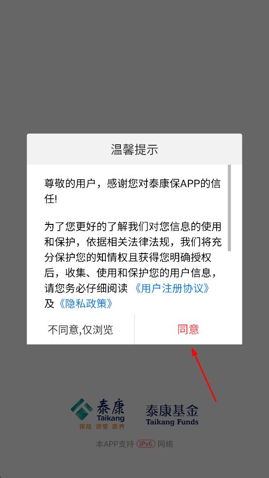 1、打开泰康保APP,在温馨提示页面,点击“同意”,进入APP主界面后,点击右下角“我的”。